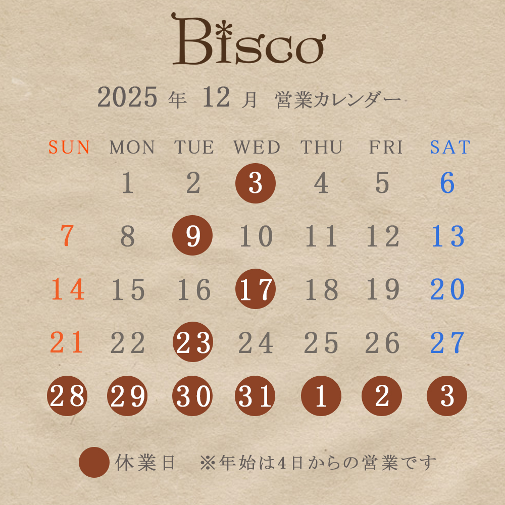 2025年11月29日に投稿 投稿者 sakuma — コメントを残す12月の営業日 12月は2日、16日が火曜日営業となっております。年末の営業は27日まで、年始は4日からの営業です。よろしくお願いいたします。 投稿ナビゲーション前の投稿: 11月25~27日は店頭販売お休みです次の投稿: 2026年1月の営業日 コメントを残す コメントをキャンセルメールアドレスが公開されることはありません。 ※ が付いている欄は必須項目ですコメント ※ 名前 ※ メール ※ サイト 次回のコメントで使用するためブラウザーに自分の名前、メールアドレス、サイトを保存する。