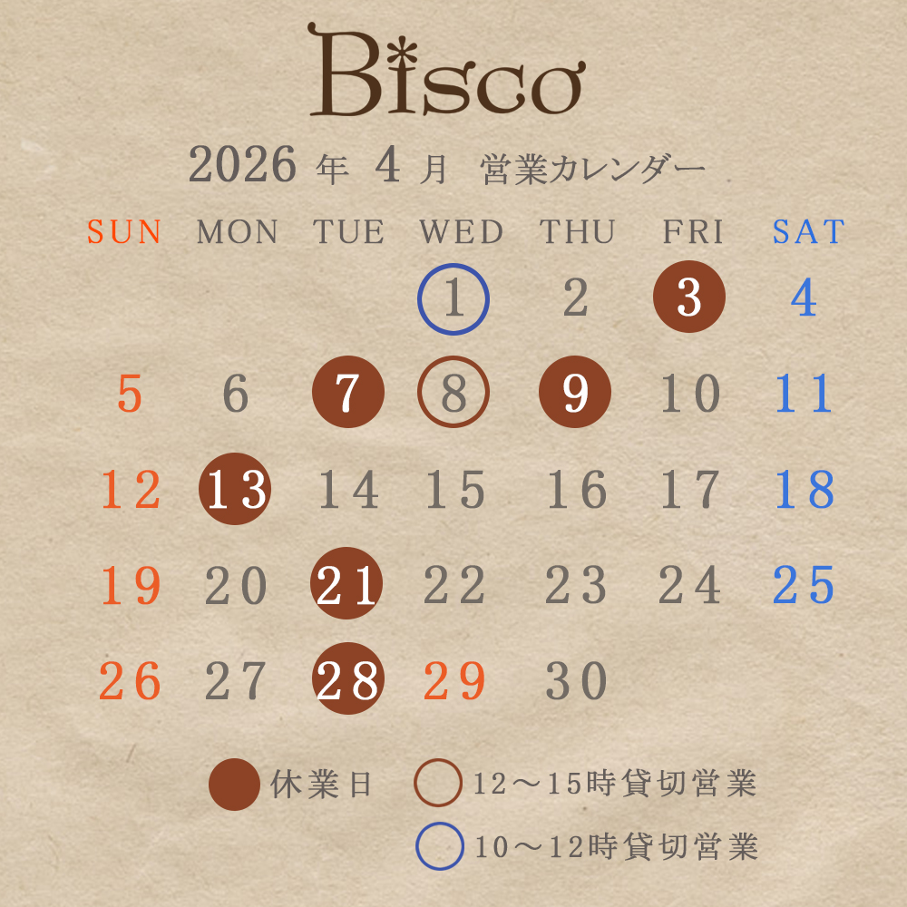 4月の営業は第3週が火曜日営業です。又、1日と8日に貸切商談が入っておりますので、営業時間が一部短縮されておりますので、お間違いのないようよろしくお願い致します。
